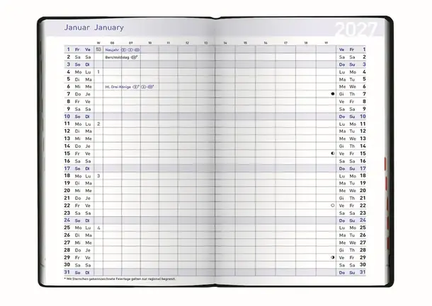Praktischer Taschenkalender. Einband PVC, schwarz. 32 Seiten, geheftet. Pro Monat eine Doppelseite. 16-seitiges Registerheft A–Z. Kalendarium: d-e-f-i. Kal 8,7 x 15,3 cm