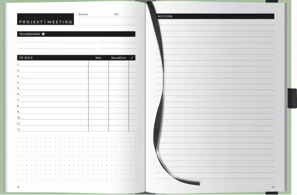 Der Projekt- und Meeting-Planer sorgt für mühelose und effiziente Organisation und vereinfacht die Planung komplexer Aufgaben und Termine. Durch seine durchdachte Struktur unterstützt er dabei, Projekte zielgerichtet voranzutreiben und Meetings optimal vorzubereiten. Das praktische Lesebändchen ermöglicht schnelles Wiederfinden wichtiger Seiten, während der integrierte Stifthalter sicherstellt, dass der passende Stift immer griffbereit ist. Der Gummiverschluss hält den Planer kompakt zusammen und schützt die Inhalte – ideal für den Alltag unterwegs. Ein unverzichtbares Tool, um stets den Überblick zu behalten und jedes Projekt erfolgreich zu managen.; Korsch Verlag GmbH & Co. KG | Landsberger Straße 77; 82205 Gilching | info@korsch-verlag.de