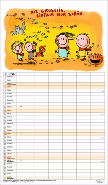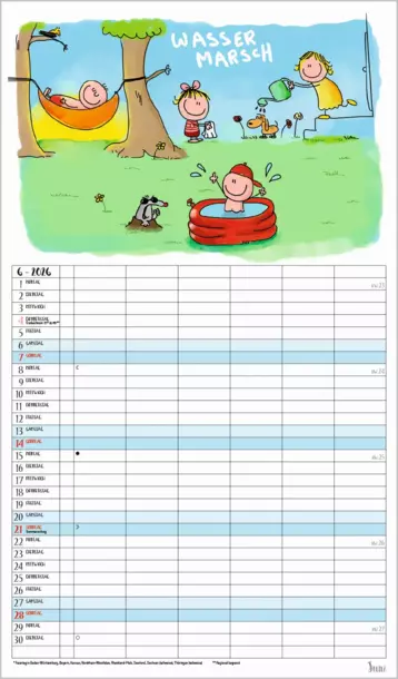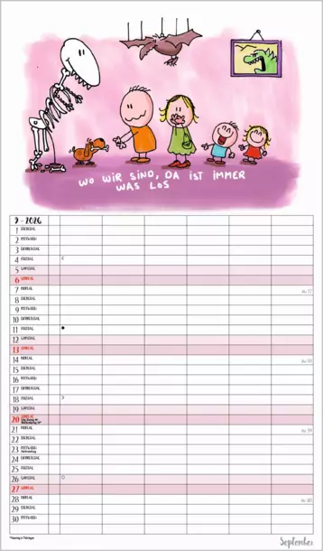 6 Spalten zum Eintragen bringen sogar die Terminplanung von Großfamilien übersichtlich auf eine Seite. Bei den witzigen Cartoons, die typische Familiensituationen zeigen, freut man sich jeden Monat schon aufs nächste Blatt. Mit Ferienterminen und Vorschau bis März des Folgejahres.