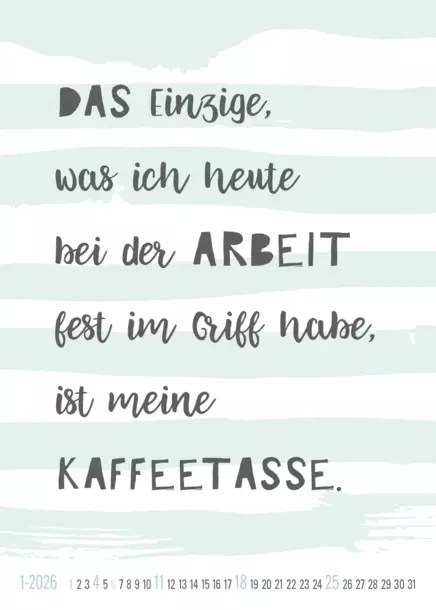 Dieser charmante Tischkalender mit 12 witzigen Bürosprüchen bringt jeden Monat frischen Wind in den Arbeitsalltag. Als trendiger Eyecatcher sorgt er mit einem Augenzwinkern für gute Laune am Schreibtisch. ; Korsch Verlag GmbH & Co. KG | Landsberger Straße 77; 82205 Gilching | info@korsch-verlag.de